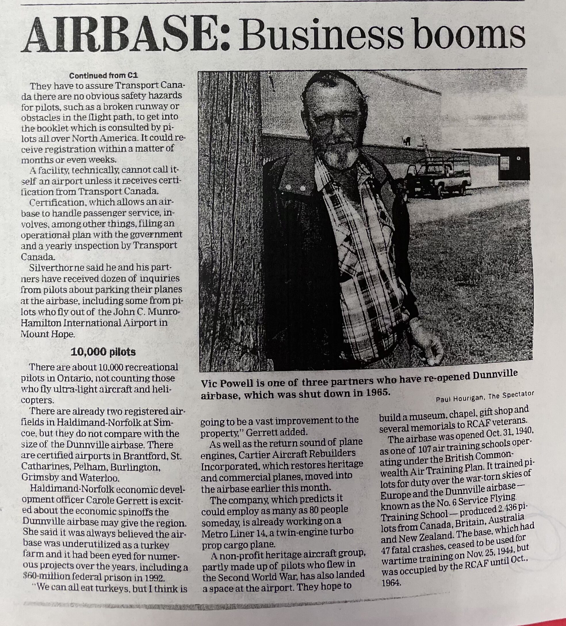 In the post-war years, the airport was used by 424 (Light Bomber) Squadron (Auxiliary) from RCAF Station Mount Hope for summer camps. In the early 1950s, the airport was also designated as an emergency landing field for Air Defence Command and as a result, the runway was expanded to 6000 feet.