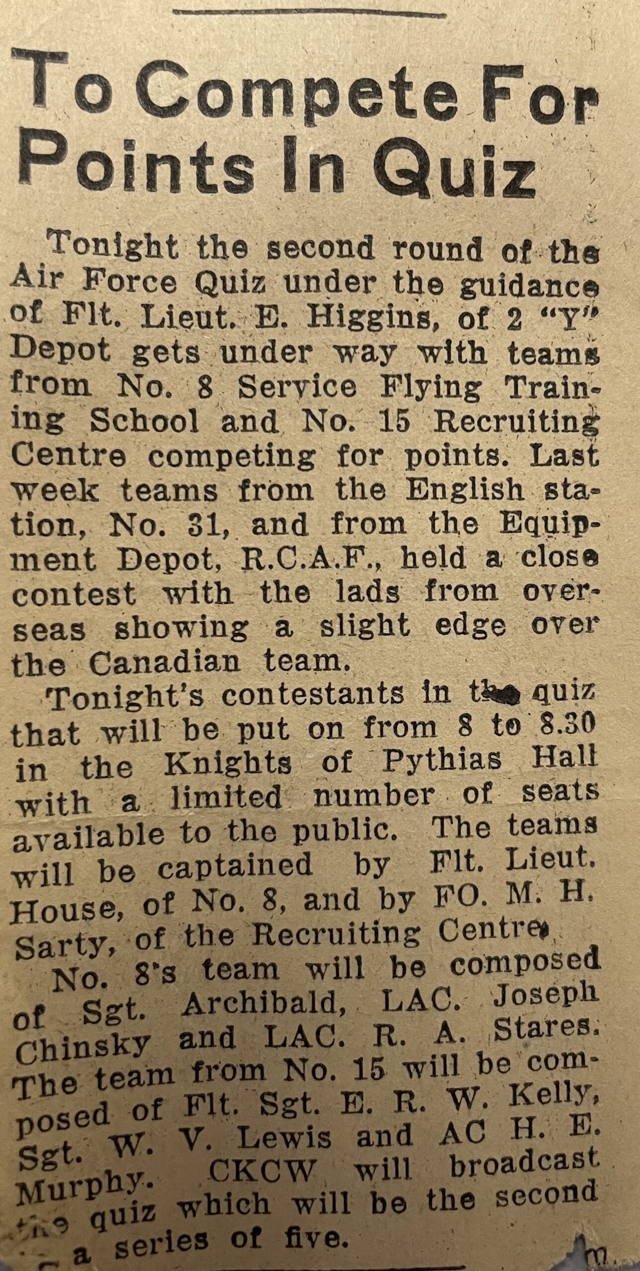 Also at the Avenue Road Detachment were the RCAF Personnel Applied Research Unit, part of the Aircrew Selection Unit at RCAF Station Downsview, the Flying Personnel Medical Establishment and the Institute of Aviation Medicine.
