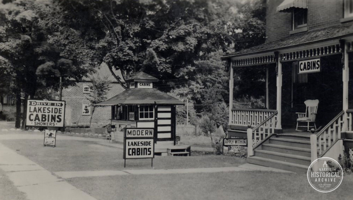 Lake Simcoe Motel had humble beginnings as Smith Cabins, established in the early 1920s by Simcoe County Deputy Sheriff Benjamin Walker Smith, son of Simcoe County’s first sheriff, B.W. Smith. Smith allowed people to stay overnight on his property overlooking Blake Street. Originally, guests would simply pitch a tent on Smith’s property. Later, the Barrie Kiwanis Club built washrooms opposite Smith’s property on the original site of Barrie Collegiate on the north-west corner of Blake Street and Rodney Street. The washrooms were moved to the Smith property after a neighbour complained.