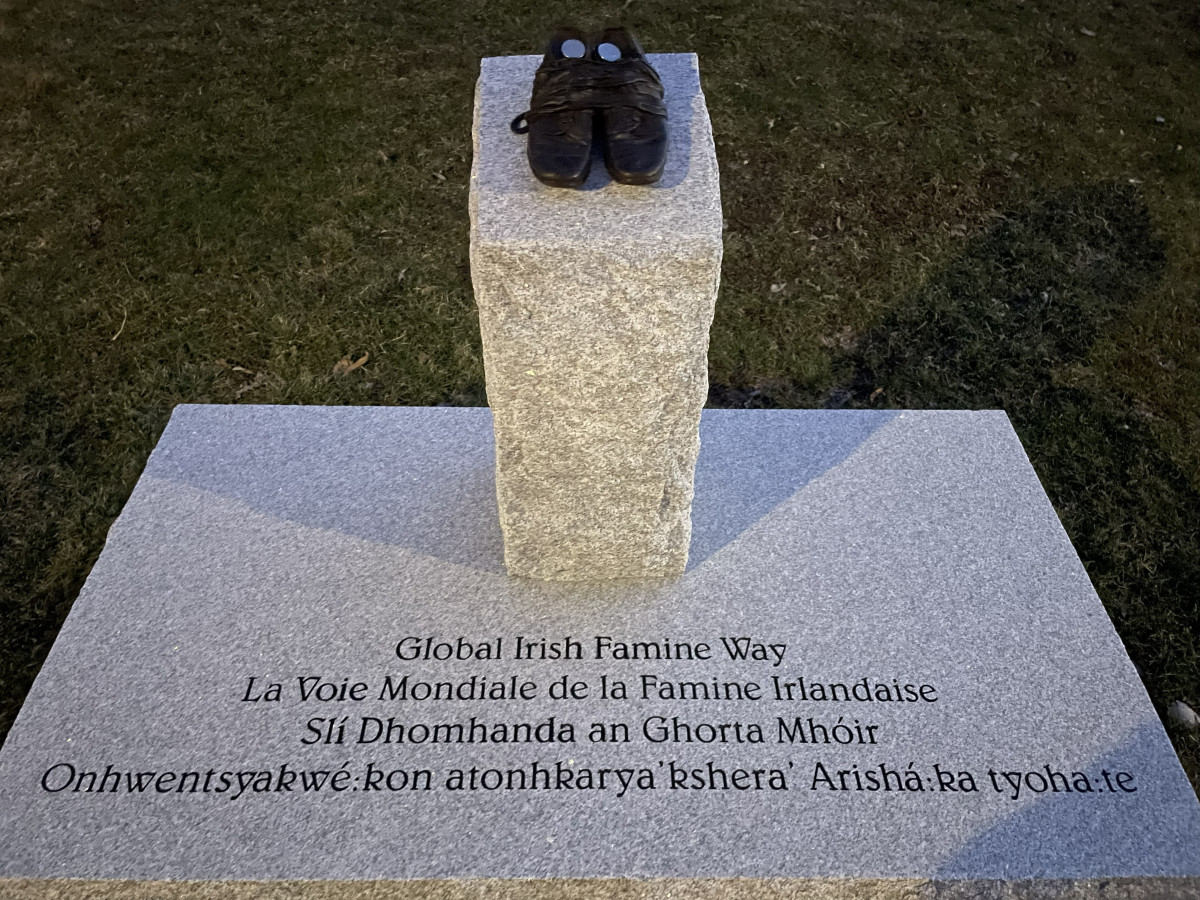The memorial features a bronze casting of a pair of battered children’s shoes, modelled on footwear once worn by a child survivor of the famine and set on a rectangular stone plinth atop a concrete base.