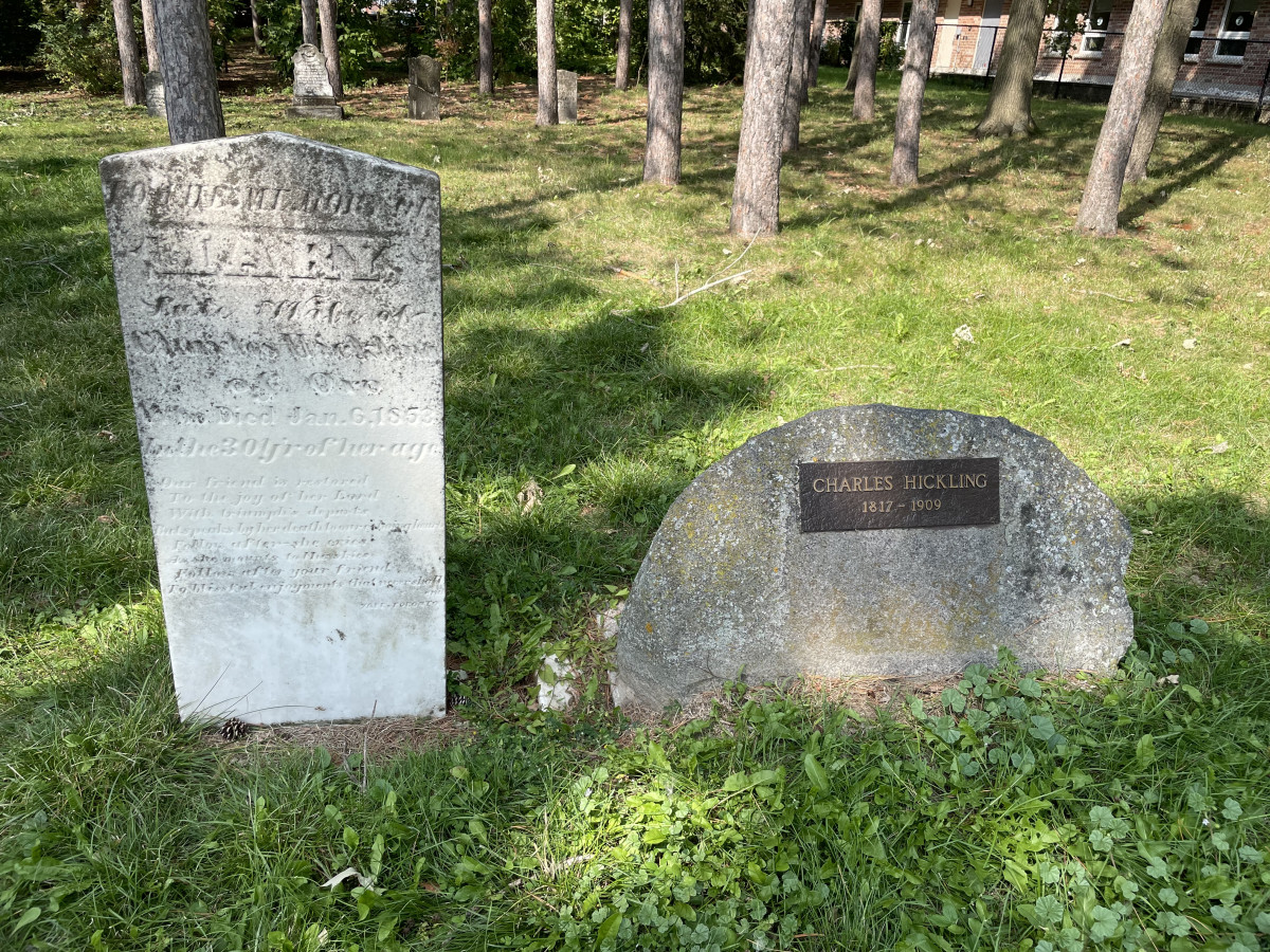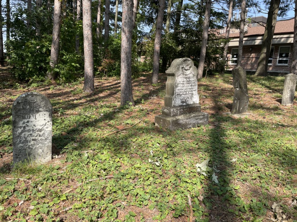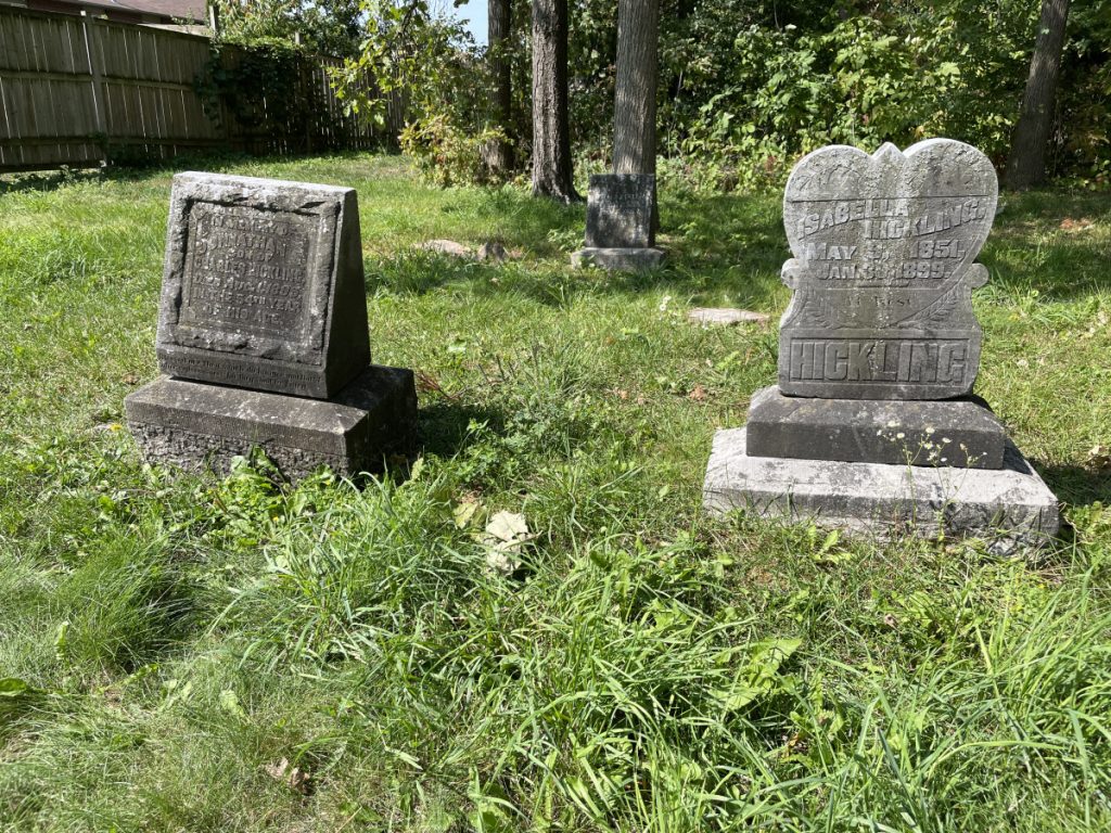 Amongst the sixteen known burials in the cemetery are John and Clarissa along with their son, John Duffield Lawrence and his wife, a native woman whose name is unknown, are all buried in unmarked graves near the front of the property on the north side.  Other than the Lawrence family, other notable names also found on the ten gravestones, some faded and barely readable, are members of the Hickling family, the namesake of nearby Hickling Trail residential street, and the Bishop family, namesake of Bishop Drive in the south-west end of Barrie.