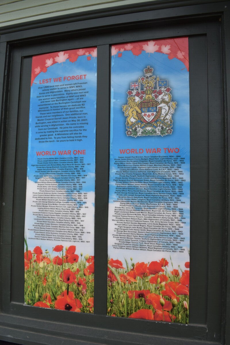 - Memorial to those from the Burlington area in the wars, many of whom departed from the Freeman-Burlington Junction Station, June 2025. Photo: Bruce Forsyth.