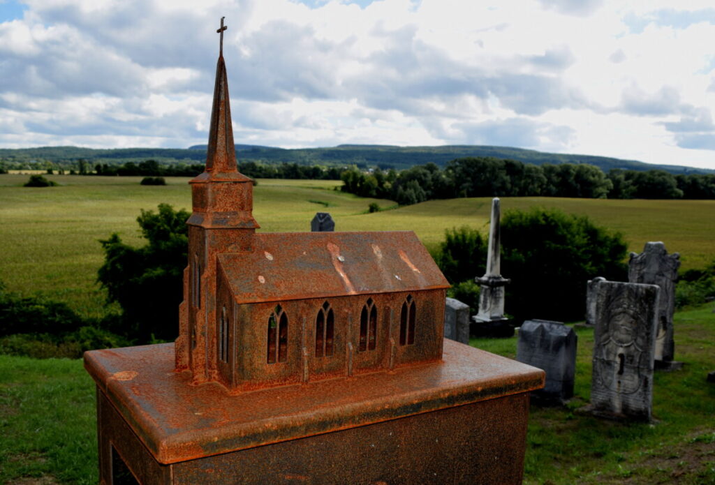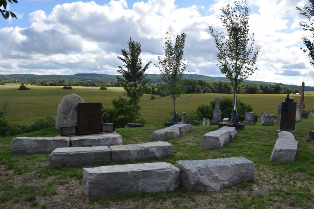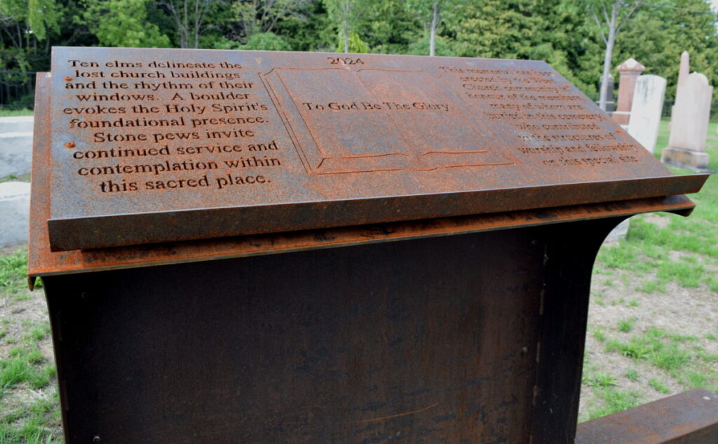 The memorial includes six stone pews, a steel pulpit, and five elm trees on each side. As the Elm trees grow, the branches will meet in peaked arches, imitating the gothic arches and four windows of the last two churches that stood on the land, surrounded by the cemetery.